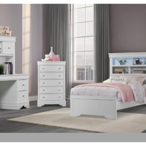 POMPEI METALLIC WHITE BOOKCASE TWIN BED WITH DESK AND HUTCH, NIGHTSTAND AND CHEST