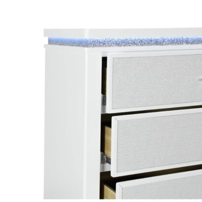 The Alina Dresser is an exquisite fusion of functionality and style. Its white finish harmonizes with LED-lit crushed glitter, while the perforated silver glam drawer fronts provide ample storage space that’s as accessible as it is striking. Each pull is a statement of luxury, ensuring your storage solutions are never dull.