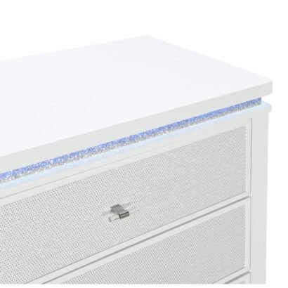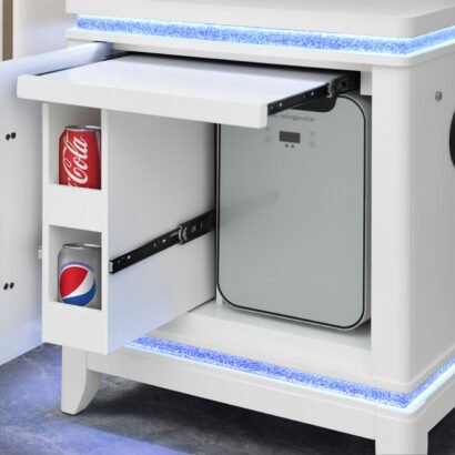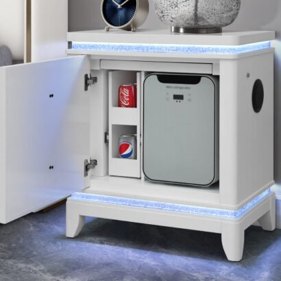 The Alina Nightstand is the ultimate bedside companion, blending convenience with glamour. Featuring LED lighting and crushed glitter surfaces, it creates a nightly spectacle. A built-in cooler keeps your favorite beverages within arm’s reach, while a hidden shelf offers discreet storage for your most personal essentials. For added modern luxury, a side speaker delivers rich sound, and integrated USB ports ensure your devices stay charged through the night. With Alina, beauty meets innovation in every detail.