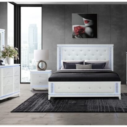 Elevate your bedroom to a realm of elegance with the Alina Bedroom Collection by Global Furniture USA. This collection is a symphony of opulence and state-of-the-art design, infused with a stunning white finish that exudes luxury. Each piece is meticulously crafted with LED accents that illuminate the crushed glitter embellishments, creating an ambiance of glamour and sophistication. The centerpiece, a bed with a fabric tufted headboard and footboard, sparkles with crystal accents, promising to be a dazzling focal point in your bedroom. Complementing the bed, the dresser, chest, and nightstand boast perforated silver glam finishes on the drawer fronts, providing a cohesive look that’s both modern and chic. The Alina Collection, with its attention to detail and sumptuous finishes, is the quintessential choice for those seeking to imbue their bedroom with a touch of upscale charm.