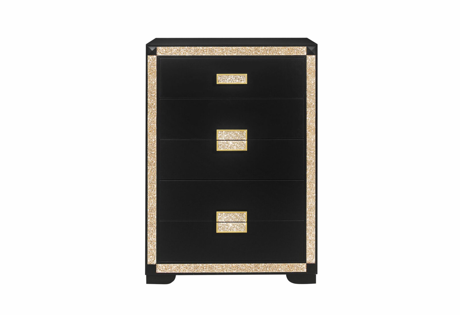 The Blake collection combines style and elegance with many beautiful features. The collection is outlined with gold colored crushed crystal to highlight its unique design. The Bed has a tall headboard and two lights along with quilted padding. The lights add style, design and function which can be used as reading lights. The quilted padding complements the design and adds comfort. All the other pieces have the black finish and crushed gold crystal outline complemented by the black and gold hardware.