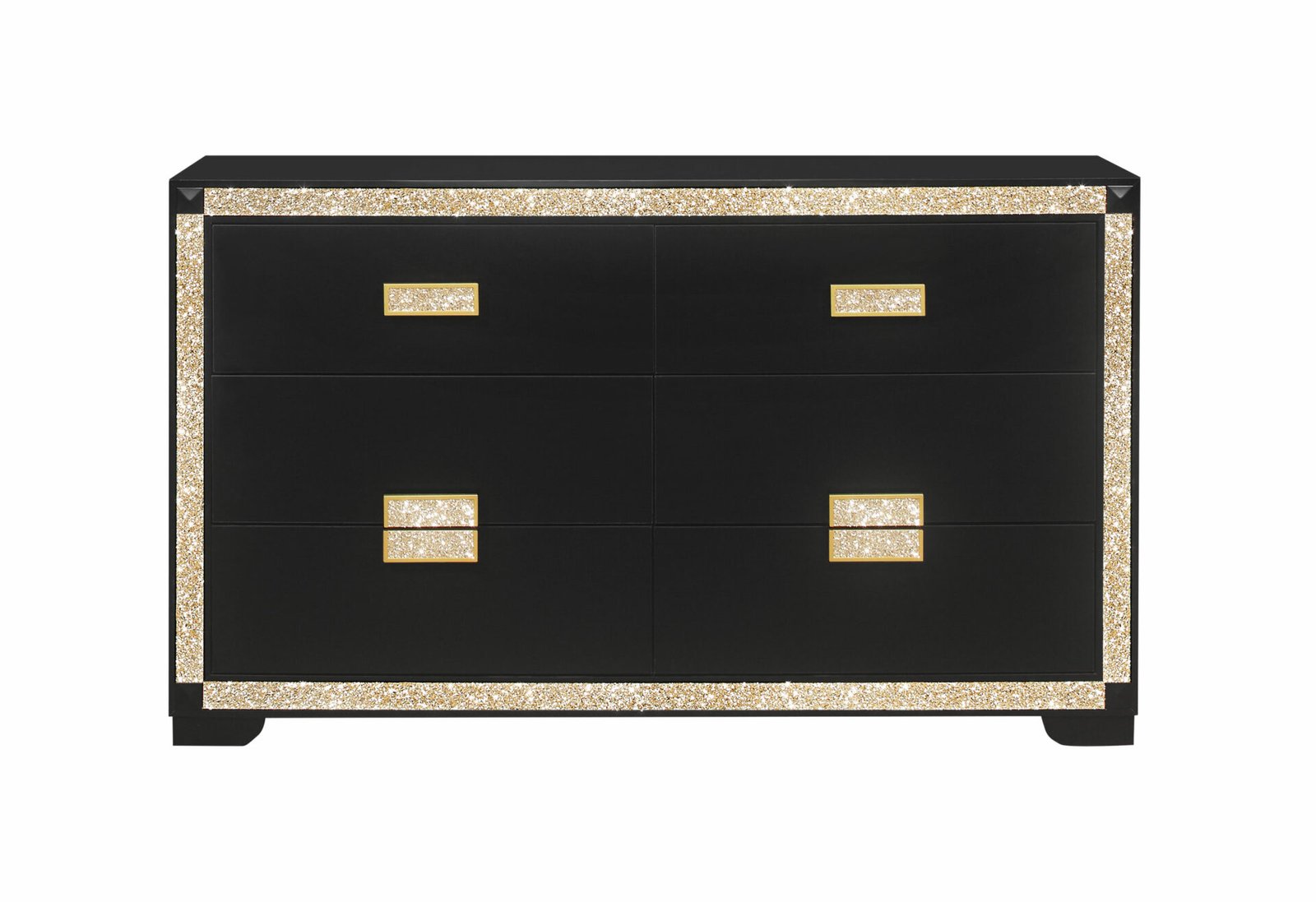 The Blake collection combines style and elegance with many beautiful features. The collection is outlined with gold colored crushed crystal to highlight its unique design. The Bed has a tall headboard and two lights along with quilted padding. The lights add style, design and function which can be used as reading lights. The quilted padding complements the design and adds comfort. All the other pieces have the black finish and crushed gold crystal outline complemented by the black and gold hardware.