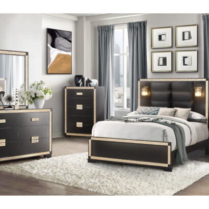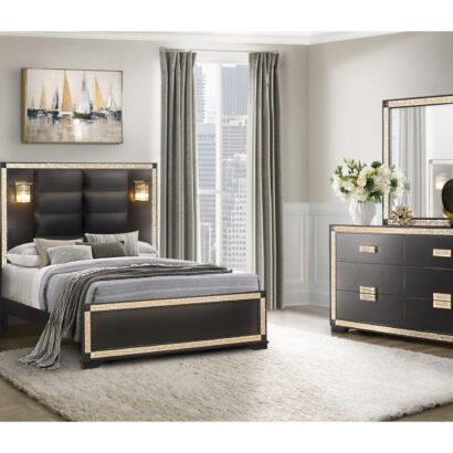 BLAKE BLACK/GOLD FULL BED WITH LAMPS, DRESSER, MIRROR, NIGHTSTAND