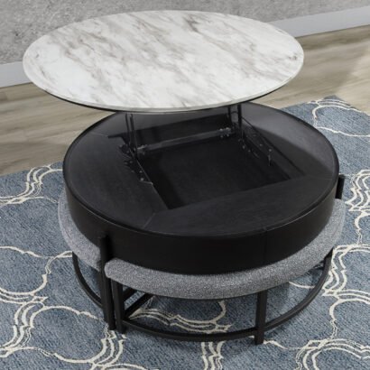 Elevate your living space with the modern elegance and innovative design of the T42 Multi-Functional Swivel Coffee Table. This statement piece features a dynamic three-tier structure, combining a sleek white faux marble top, a warm wood-finished middle tier, and plush, upholstered ottoman-style seating. The rotating faux marble and wood surfaces offer versatile configurations, perfect for entertaining, serving, or everyday use. A hidden compartment at the center keeps essentials organized and out of sight and the soft, upholstered sections seamlessly tuck under the table and double as extra seating or footrests. Ideal for contemporary interiors, the T42 brings together practicality and sophistication in one cohesive design. Perfect for small spaces or open-concept living rooms looking for a multifunctional centerpiece.