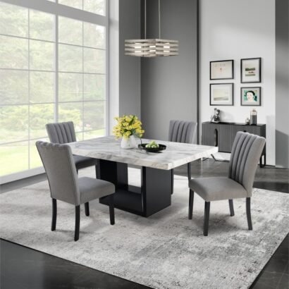 Elevate your dining experience with the exquisite D02 Dining Table and D8683 Dining Chair Kit by Global Furniture USA. This charming set combines the natural elegance of a faux marble tabletop and a sleek black finish on the base with the sophistication of durable, grey-finished dining chairs adorned with Chanel pleats on the seat back. Designed for durability and crafted with care, this dining set promises years of enjoyment and a timeless appeal that blends seamlessly into any decor. Perfect for intimate dinners or gatherings, this kit includes one D02 Dining Table and four D8683 Dining Chairs, offering a harmonious blend of style and comfort.