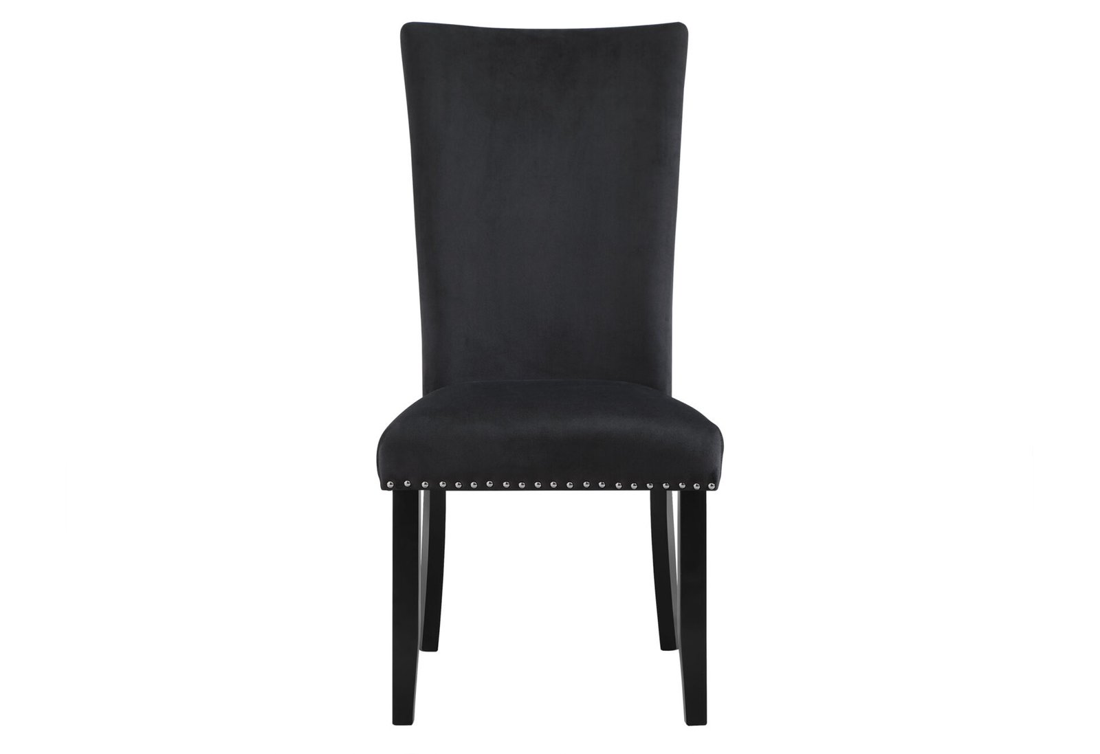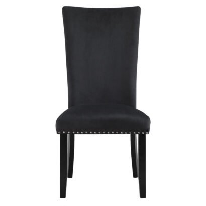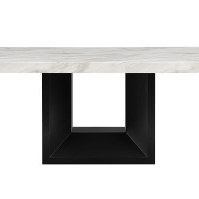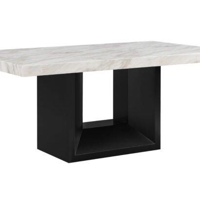 White Faux marble design with extra thick top and a large angle cut wood base. The 6 black upholstered chairs match the base the nail head trim accents the seat and back.