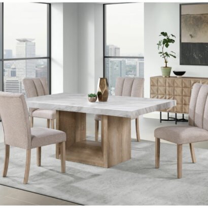 Elevate your dining experience with the exquisite D02 Dining Table and D8683 Dining Chair Kit by Global Furniture USA. This charming set combines the natural elegance of a faux marble tabletop and a warm, natural wood finish base with the sophistication of durable, beige-finished dining chairs adorned with Chanel pleats on the seat back. Designed for durability and crafted with care, this dining set promises years of enjoyment and a timeless appeal that blends seamlessly into any decor. Perfect for intimate dinners or gatherings, this kit includes one D02 Dining Table and four D8683 Dining Chairs, offering a harmonious blend of style and comfort.