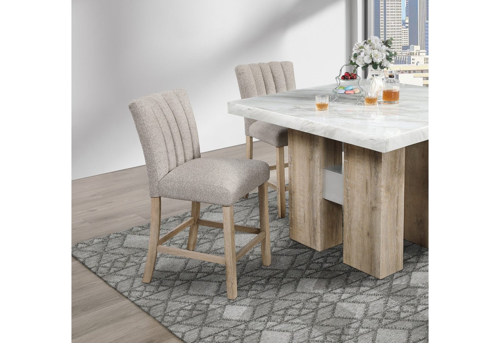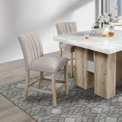 Completing the look, the 6 D8685 Bar Stool is as inviting as it is refined. A warm wood finish frames its plush, neutral beige upholstery, while a channel-tufted backrest lends tailored elegance. Overstuffed cushioning ensures exceptional comfort, making it just as perfect for a lingering breakfast as it is for evening cocktails with friends. Whether positioned alongside the D04 Bar Table or tucked against a kitchen island, the 6 stool’s graceful design and durable build promise lasting appeal.
