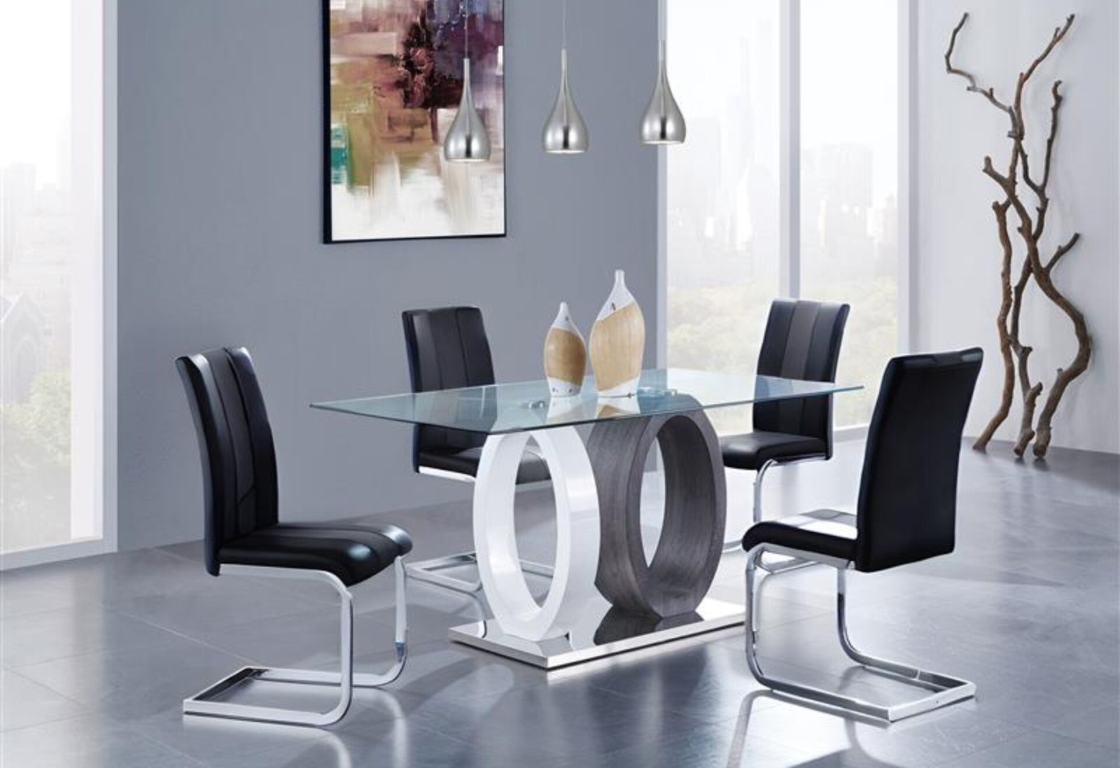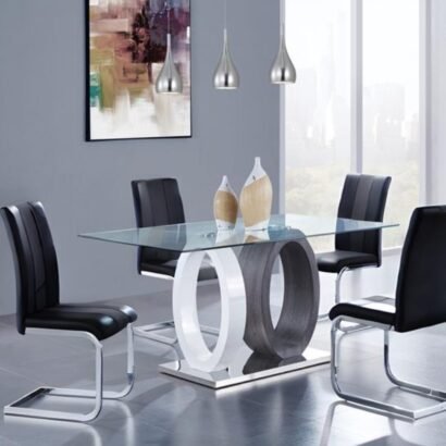 Striking ultra modern design and bold styling this dining table by Global Furniture USA is in a class all by itself. This table boasts a rectangular clear glass top, contrasting oval design supports and stainless steel base with a polished chrome finish. Add this to your dining area and it will be the topic of conversation with all your guests.