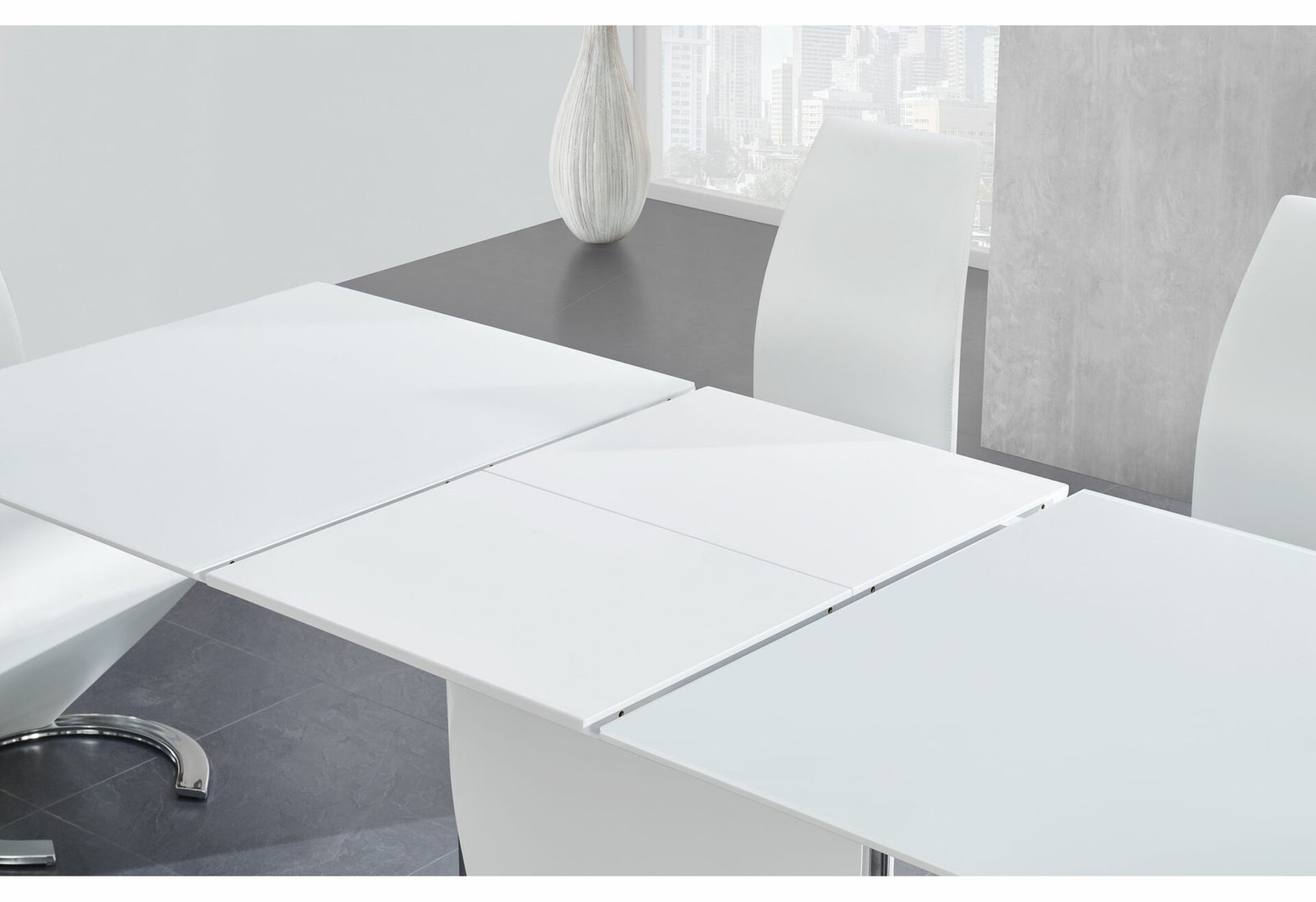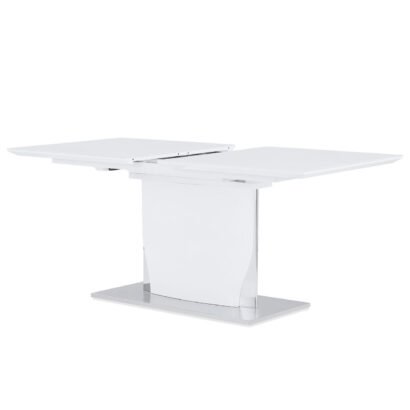 Enjoy cutting-edge and minimalist style that’s as eye-catching as it is practical for your contemporary dining space. A high gloss white finish with brushed stainless steel accents is sleek and on-trend. The glass top over white high gloss wood extends from 63in to 87in to accommodate all of your guests, and the self storing butterfly leaf hides seamlessly just below the tabletop when not in use.