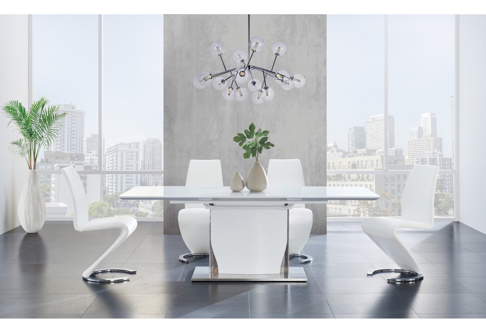 Enjoy cutting-edge and minimalist style that’s as eye-catching as it is practical for your contemporary dining space. A high gloss white finish with brushed stainless steel accents is sleek and on-trend. The glass top over white high gloss wood extends from 63in to 87in to accommodate all of your guests, and the self storing butterfly leaf hides seamlessly just below the tabletop when not in use.