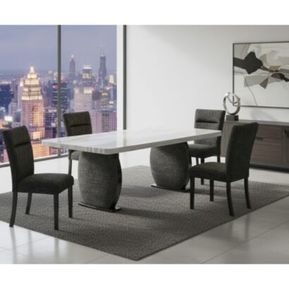 Create a striking focal point in your dining space with the D2502 Dining Table and Dining Chair set by Global Furniture USA. The table showcases a sophisticated grey faux marble top that adds a sleek modern touch, while its curved base legs feature an eye-catching glitter texture that brings contemporary elegance and visual interest. Coordinating beautifully with the table, the D2502 chairs are upholstered in a rich blend of black and grey fabric, providing both stylish contrast and comfortable seating. Together, this set delivers refined style and everyday functionality that elevates any dining room.