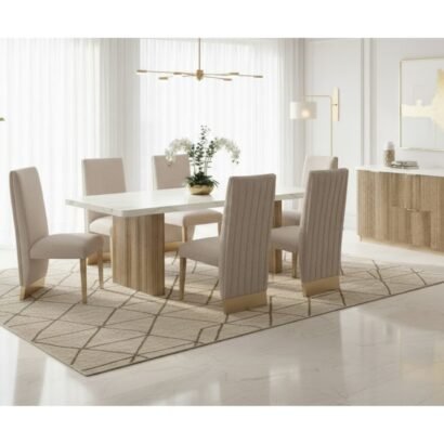 Bring refined sophistication to your dining space with the D2504 Dining Collection by Global Furniture USA, a stunning showcase of modern design and natural elegance. The centerpiece of the collection — the dining table with a white faux marble top — features soft grey veining that exudes contemporary luxury. Beneath, a pair of natural-tone fluted double pedestals provide both sculptural beauty and exceptional stability, creating a striking visual statement from every angle.