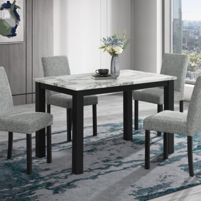 The D8032 White and Black Dining Table paired with the D9026 Grey Dining Chair Collection from Global Furniture brings a contemporary and sophisticated look to your dining area. The dining table features a sleek white melamine top with dark veining, offering a bold and modern aesthetic that effortlessly enhances any space. It is complemented by the D9026 Grey Dining Chairs, which provide comfort and style with their soft light grey upholstery and streamlined design. This elegant 5-piece set includes one dining table and four chairs, all carefully packaged to ship in one convenient carton. Perfect for both everyday dining and special occasions, this dining set offers both beauty and practicality for your home.