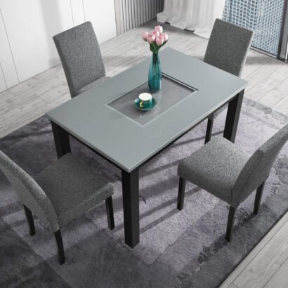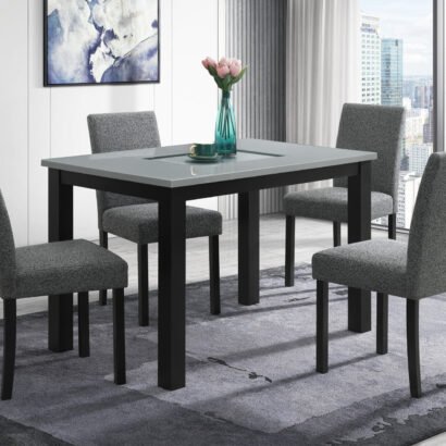 The dining table features a high-gloss dark grey lacquer top that brings a sleek, contemporary vibe to your space, while a stunning crushed crystal insert adds a shimmering accent for extra visual appeal. Paired with dark grey upholstered chairs, this collection offers both comfort and style in one cohesive design. Ideal for smaller spaces or anyone seeking a chic, ready-to-assemble dining solution, the D8112 Collection delivers modern luxury with everyday practicality.