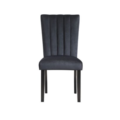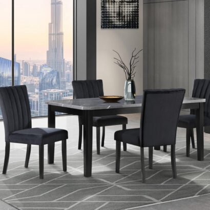 This dining table has smooth clipped corner edges with a beautiful grey tone faux marble design. The channel back chairs add comfort and great design elements and the matching bench ties it all together.