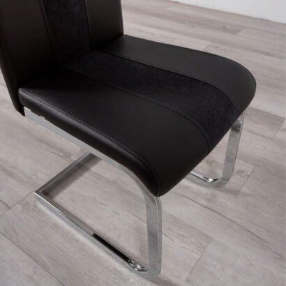 Perfect for your kitchen or breakfast nook, this two-toned dining chair will transform your room and add comfort and charm. This chair is upholstered in tones of black faux leather (PU) and fabric, providing an eye-catching and modern twist to traditional kitchen seating. Decorating possibilities are endless with the attractive tones of this chair. Additional design elements include a sleek style silver toned metal base and ample padding, continuing the delightful look and comfy feel of this seating. Quality craftsmanship in every facet of production ensures durability and long-lasting wear. For a stylish and modern take on kitchen or dining room furnishings, this chair is a can’t miss choice in comfortable seating.