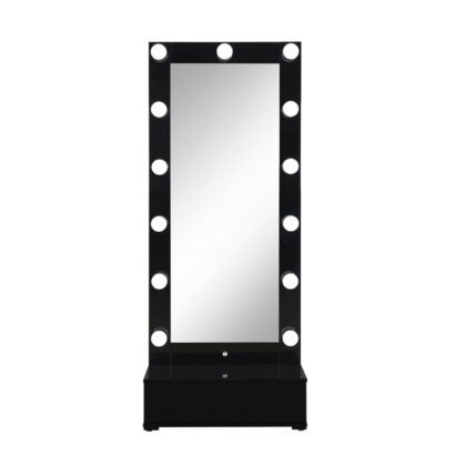 The Ella Black Narrow Mirror with Drawer by Global Furniture is a sleek and functional addition to any modern bedroom or dressing space. This floor-length LED mirror offers full-body visibility with elegant, built-in lighting to brighten your look and your room. Finished in glossy black, it features a discreet storage drawer for accessories or daily essentials, and a built-in speaker to enhance your routine with music or audio.