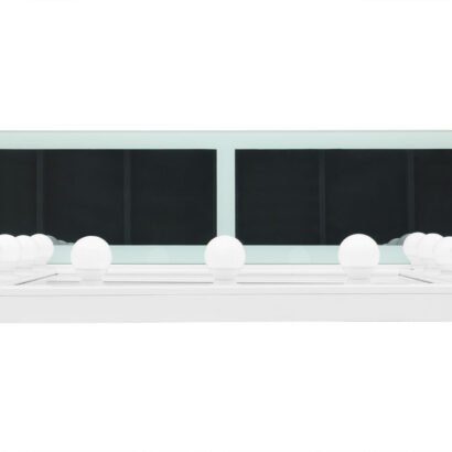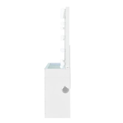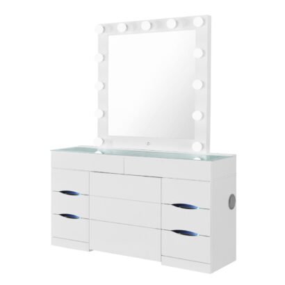Elevate your beauty routine with the Ella White Vanity Set by Global Furniture, a perfect blend of luxury, innovation, and modern design. Finished in a sleek white lacquer, this stunning vanity features a built-in LED bulb mirror for bright, clear lighting—ideal for flawless makeup application or daily grooming. The glass top is accented with soft LED lighting, adding a stylish glow to your space, while a built-in speaker brings entertainment and connectivity to your routine.
