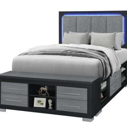 The Emma Full Bed is the centerpiece of this stunning collection, blending modern elegance with unparalleled functionality. The padded grey upholstered headboard features an LED light and USB ports for added convenience, perfect for reading or charging devices. With its ingenious all-around storage design which provides ample space for bedding, clothing, and more. The two-tone black and grey finish completes the contemporary look, making this bed a true standout in any bedroom.