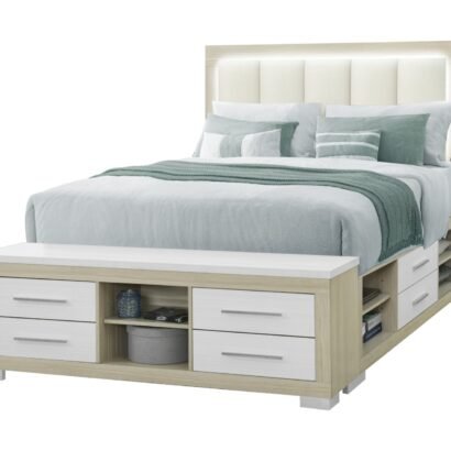 The Emma Queen Bed is the centerpiece of this stunning collection, blending modern elegance with unparalleled functionality. The padded white upholstered headboard features an LED light and USB ports for added convenience, perfect for reading or charging devices. With its ingenious all-around storage design which provides ample space for bedding, clothing, and more. The two-tone natural wood and white finish completes the contemporary look, making this bed a true standout in any bedroom.