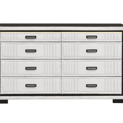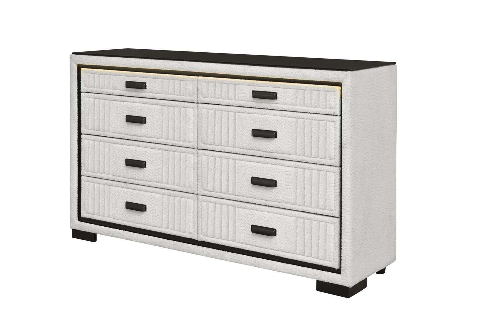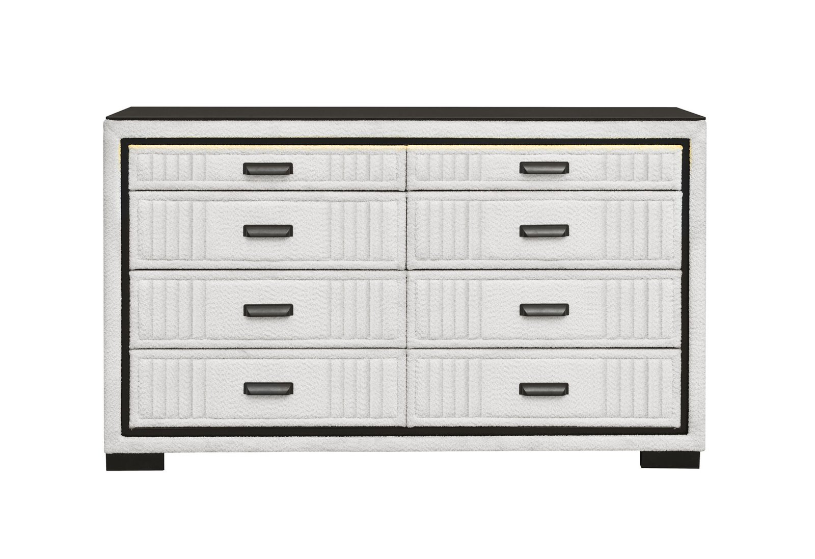 Wrapped in white upholstery with fluted drawer fronts for a soft yet structured look, the Isabella Dresser features LED lighting to create a serene, modern glow. Spacious drawers offer practical storage, while the luxe finish and contemporary details make it a standout in any bedroom.