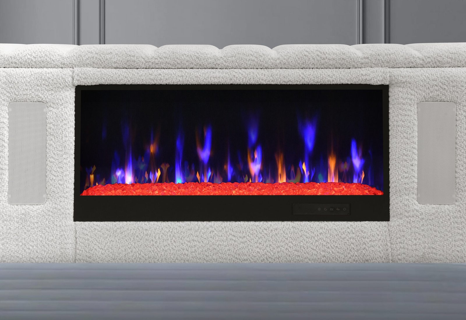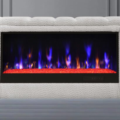 This collection seamlessly blends style and innovation. The dresser, chest, nightstand, and mirror are all equipped with integrated LED lighting, enhancing the ambiance with a subtle, modern glow. The queen bed is the true showstopper—featuring headboard LED lighting, a footboard with a built-in 50″ TV lift, a crystal-insert fireplace, and Bluetooth speakers, all designed to bring comfort and entertainment to the forefront of your bedroom experience.