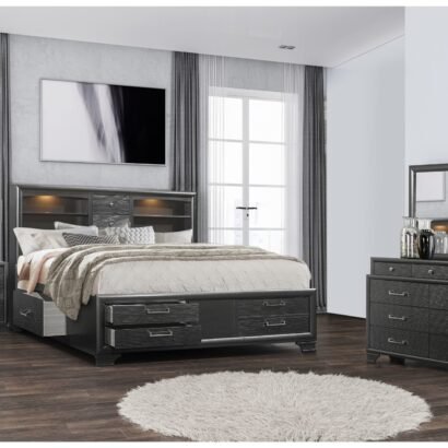 Introducing the Jordyn Bed Group from Global Furniture USA, the ultimate statement for any bedroom. The bed is designed with a platform design, eliminating the need for a box spring while adding room for storage drawers. The headboard features built-in lighting and two storage drawers for convenience. All case pieces are lacquer finished and feature nickel hardware. Upgrade your bedroom with the Jordyn Bed Group and enjoy its sleek and modern design for years to come.