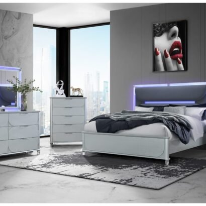 Enhance your bedroom with the contemporary elegance of the Lando Bedroom Collection by Global Furniture USA. This stunning collection is finished in a sophisticated grey hue and embellished with chic acrylic accents, offering a perfect blend of modern design and luxurious detailing. The centerpiece bed features an upholstered headboard with acrylic trim and integrated LED accents, creating a captivating focal point. The mirror also boasts LED accents, adding a touch of modern flair. The dresser includes two hidden jewelry drawers for discreet storage, while the other case pieces are designed with full extension drawers, top felt-lined drawers, and textured drawer fronts for added style and functionality. The Lando Bedroom Collection is designed to be a showstopper, bringing both elegance and practicality to your home.
