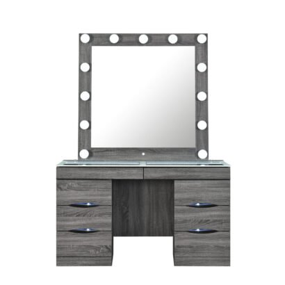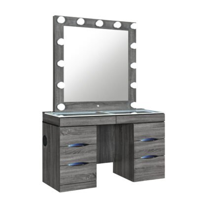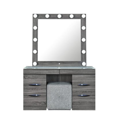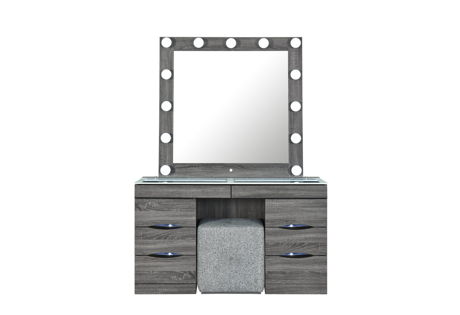 Elevate your beauty routine with the Lexi Grey Vanity Set by Global Furniture, a perfect blend of luxury, innovation, and modern design. Finished in a cool grey, this stunning vanity features a built-in LED bulb mirror for bright, clear lighting ideal for flawless makeup application or daily grooming. The glass top is accented with soft LED lighting, adding a stylish glow to your space, while a built-in speaker brings entertainment and connectivity to your routine. Included with the set is a matching stool in a grey fabric, offering a comfortable seat for getting ready. Sleek, functional, and packed with modern features, the Lexi Grey Vanity Set turns any bedroom or dressing area into a chic, organized personal retreat.