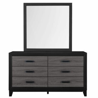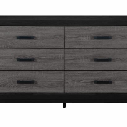 With its urban farmhouse design, the best of farmhouse and urban living combine to create an upscaled farmhouse appearance. The case pieces are black with rustic grey wood inlay. In addition to the two-tone design, the metal hardware completes the mixed media look and adds a modern flair.