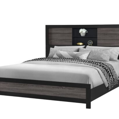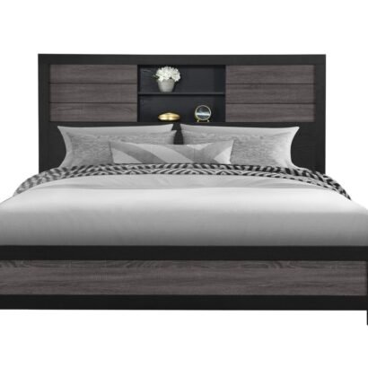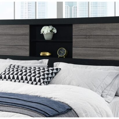 Crafted with a striking contrast of grey and black finishes, the Lisbon King Bed boasts a modern aesthetic that complements a variety of decor styles. The headboard is a true showstopper, featuring built-in bookcases that offer convenient storage for your bedtime essentials. Display your favorite books, decorative items, or cherished mementos on the open shelves, adding a personal touch to your sleeping sanctuary.