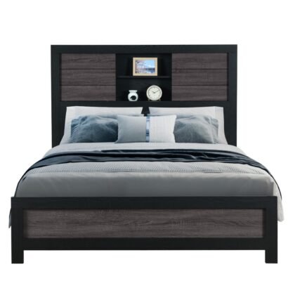 Crafted with a striking contrast of grey and black finishes, the Lisbon King Bed boasts a modern aesthetic that complements a variety of decor styles. The headboard is a true showstopper, featuring built-in bookcases that offer convenient storage for your bedtime essentials. Display your favorite books, decorative items, or cherished mementos on the open shelves, adding a personal touch to your sleeping sanctuary.