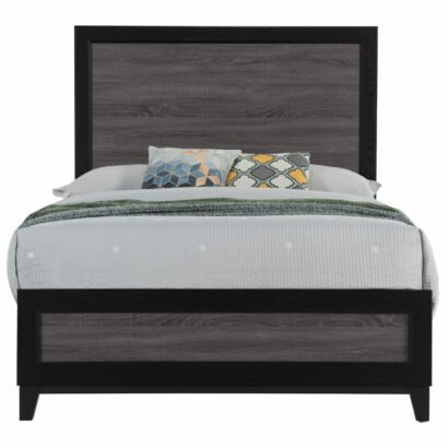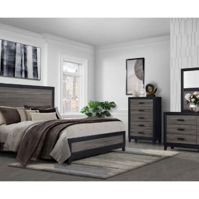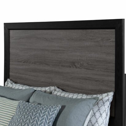 With its urban farmhouse design, the best of farmhouse and urban living combine to create an upscaled farmhouse appearance. The case pieces are black with rustic grey wood inlay. In addition to the two-tone design, the metal hardware completes the mixed media look and adds a modern flair.