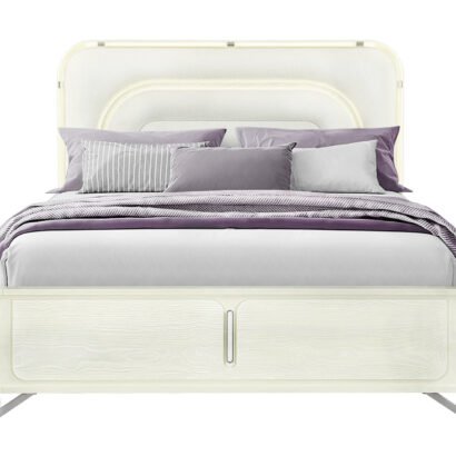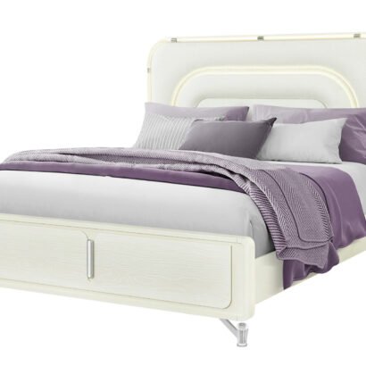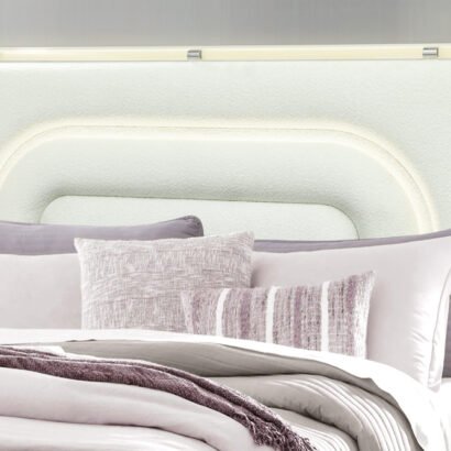 The Lyra King Bed is the ultimate statement piece, designed to blend comfort with high style. Its elegantly curved headboard, upholstered in soft white fabric, is illuminated with LED lights that follow the arc in a radiant, rainbow-like glow. Supported by a sturdy slatted base and framed in light beige wood, this bed creates a stunning centerpiece that exudes modern luxury.
