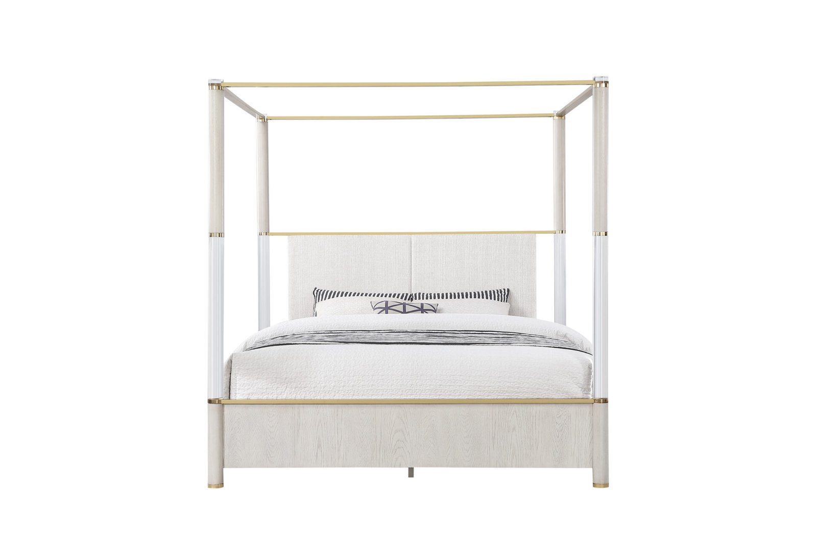 The Malmo King Canopy Bed is a stunning statement of modern luxury. Framed in a light beige oak veneer, it features acrylic posts accented with gold trim for a glamorous touch. The beige textured upholstered headboard adds softness and elegance, while matching gold accents on the canopy, headboard, and footboard complete the upscale look. With a fully slatted design for reliable support, this canopy bed is as functional as it is beautiful.