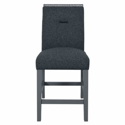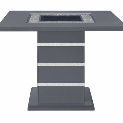 This bar table is a showcase example of how charm and a touch of elegance can dramatically change the look of your eating area. This table includes glitter detailing style elements with a sturdy construction and a high gloss finish with a clear glass inlay to round off the look. Constructed of MDF, Glass and Acrylic this dining table makes a bold statement. Finished in a Dark Grey and Silver with a center glass, rectangle shape and pedestal base you will have more than enough room to entertain and enjoy your dining experience.