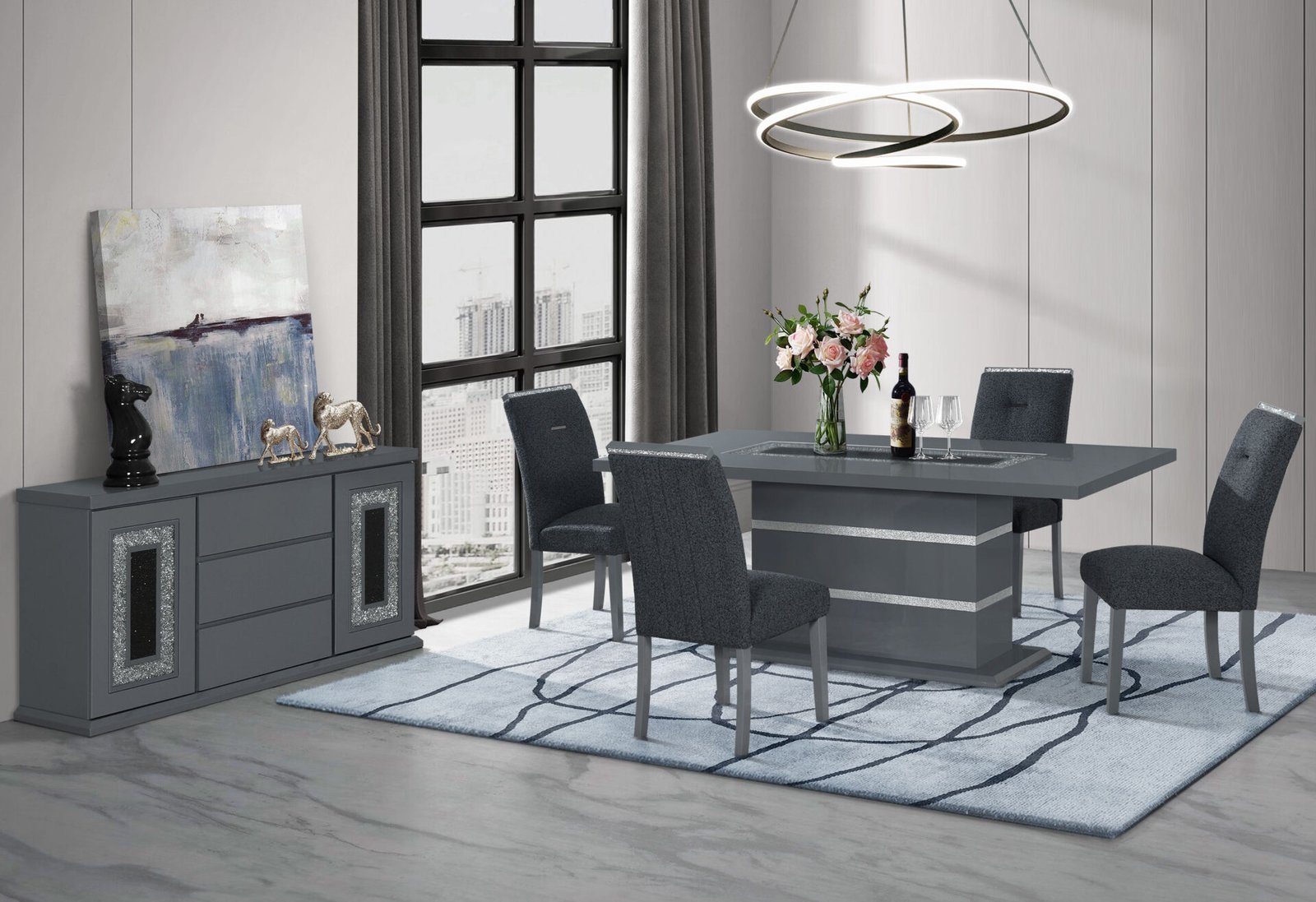 This dining table is a showcase example of how charm and a touch of elegance can dramatically change the look of your eating area. This table includes glitter detailing style elements with a sturdy construction and a high gloss finish with a clear glass inlay to round off the look. Constructed of MDF, Glass and Acrylic this dining table makes a bold statement. Finished in a Dark Grey and Silver with a center glass, rectangle shape and pedestal base you will have more than enough room to entertain and enjoy your dining experience.