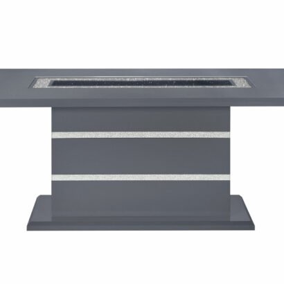 This dining table is a showcase example of how charm and a touch of elegance can dramatically change the look of your eating area. This table includes glitter detailing style elements with a sturdy construction and a high gloss finish with a clear glass inlay to round off the look. Constructed of MDF, Glass and Acrylic this dining table makes a bold statement. Finished in a Dark Grey and Silver with a center glass, rectangle shape and pedestal base you will have more than enough room to entertain and enjoy your dining experience.