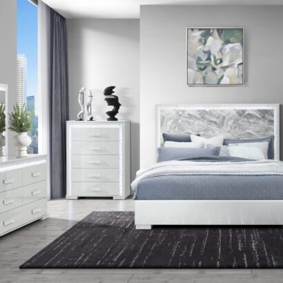 Redefine your bedroom with the sophisticated elegance of the Naomi Bedroom Collection by Global Furniture USA. This stunning set is finished in a soft light grey lacquer, creating a serene and modern atmosphere. The bed features a dramatic faux marble grey headboard with a contemporary silhouette, framed by LED light trim for a soft, ambient glow. Matching case goods — dresser, mirror, nightstand, and chest — all feature the same sleek lacquer finish and LED lighting for a cohesive, designer-inspired look. Thoughtful details like full-extension glides on every drawer ensure smooth functionality, combining modern convenience with timeless style. The Naomi Collection is perfect for anyone seeking to elevate their bedroom into a sophisticated retreat.