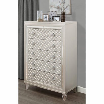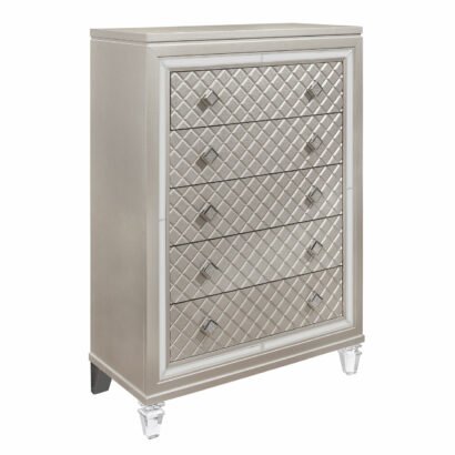 Old Hollywood Glam styling with all of the modern day features that today’s consumer has come to expect. From the eye-catching platinum metallic finish, to the fancy acrylic legs and ambient LED lighting, the Paris bedroom collection is a true show stopper.