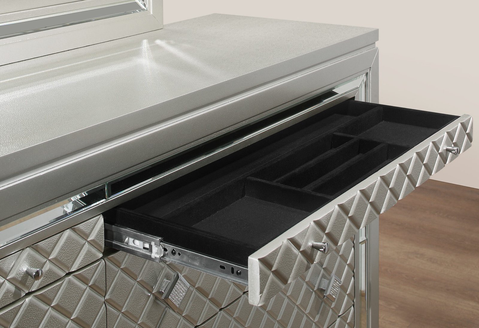 Old Hollywood Glam styling with all of the modern day features that today’s consumer has come to expect. From the eye-catching platinum metallic finish, to the fancy acrylic legs and ambient LED lighting, the Paris bedroom collection is a true show stopper.