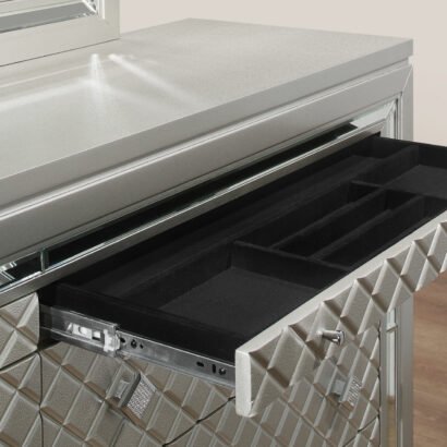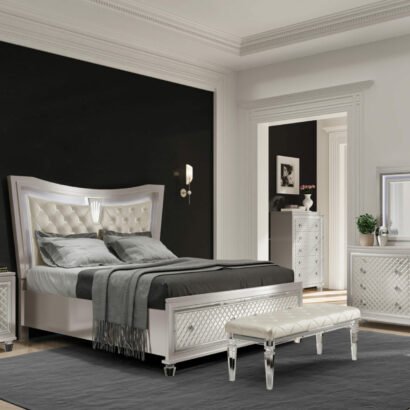 Old Hollywood Glam styling with all of the modern day features that today’s consumer has come to expect. From the eye-catching platinum metallic finish, to the fancy acrylic legs and ambient LED lighting, the Paris bedroom collection is a true show stopper.