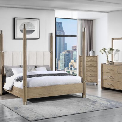 Classic design meets modern elegance in the Santo Brown Bedroom Collection by Global Furniture. Featuring a rich brown oak finish, this collection brings warmth and timeless appeal to any bedroom. The standout feature is the queen bed, designed with a white upholstered headboard and four tall bed posts, combining a traditional silhouette with updated materials for a striking focal point.