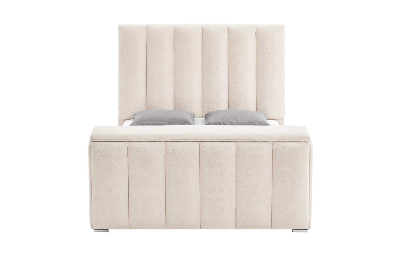 With its refined fabric, sculptural fluting, and high-tech features, the Serenity Buff Bed transforms any bedroom into a sophisticated retreat designed for both rest and entertainment.
