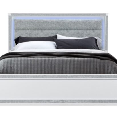 The Soleil King Bed blends modern sophistication with a touch of glamour. Its white frame is paired with a grey upholstered headboard outlined in shimmering crushed crystal trim. The built-in LED lights add a warm, ambient glow, making it a show-stopping centerpiece for your bedroom.