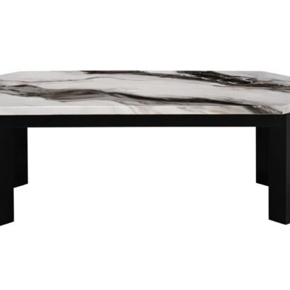 Indulge in contemporary luxury with the T06 Coffee Table, a statement piece that effortlessly anchors your space in style. The table top is adorned with a stunning faux panda marble paper finish that mimics the exquisite patterns of natural marble, adding opulence without the hefty price tag. The clean, straight lines of the black wooden legs create a sturdy frame, ensuring stability and durability while contributing to the minimalist aesthetic. This table is not only a visual delight but also a practical surface for your social and dining needs.