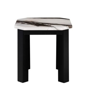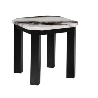 Indulge in contemporary luxury with the T06 End Table, a statement piece that effortlessly anchors your space in style. The table top is adorned with a stunning faux panda marble paper finish that mimics the exquisite patterns of natural marble, adding opulence without the hefty price tag. The clean, straight lines of the black wooden legs create a sturdy frame, ensuring stability and durability while contributing to the minimalist aesthetic. This table is not only a visual delight but also a practical surface for your social and dining needs.