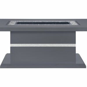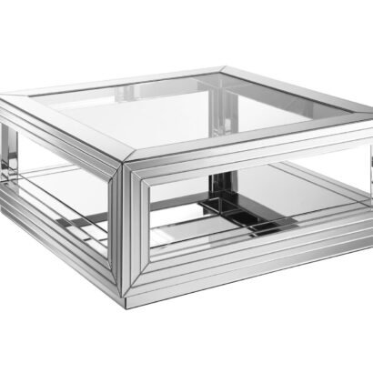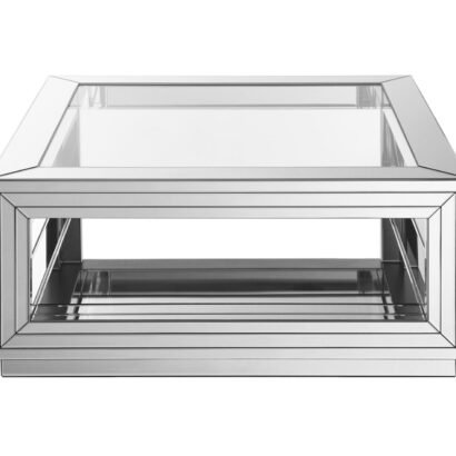 Coffee table with mirrored silver finish, constructed from glass and MDF.