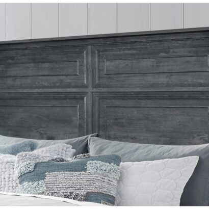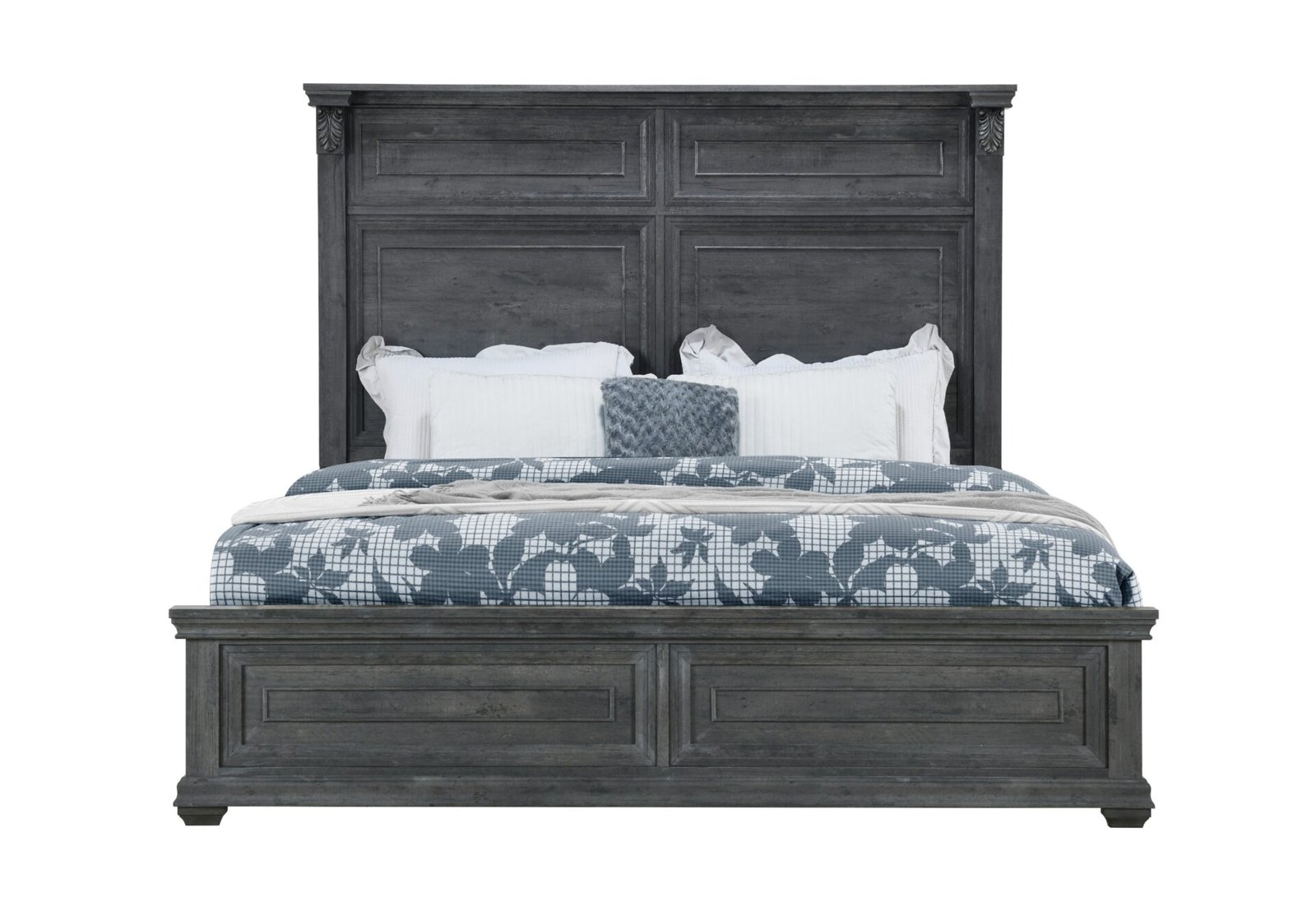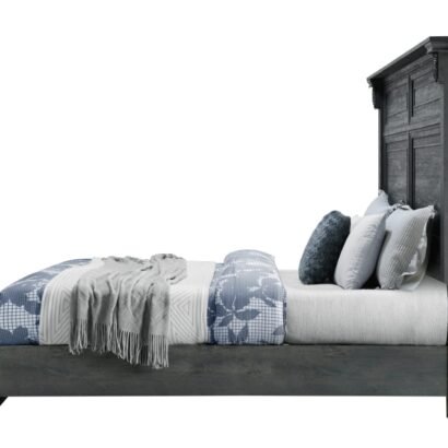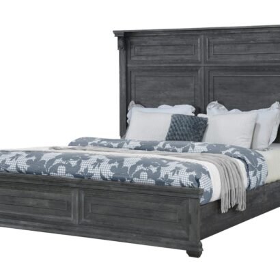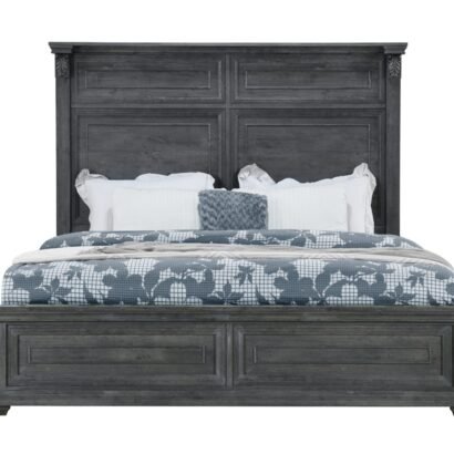The Tatum Bedroom Collection is crafted with a rustic wood finish available in natural or grey, this classic collection boasts intricate trim, rustic drawer hardware, and elegant scroll work on every piece. The large panel headboard on the bed adds a grand touch to your bedroom.